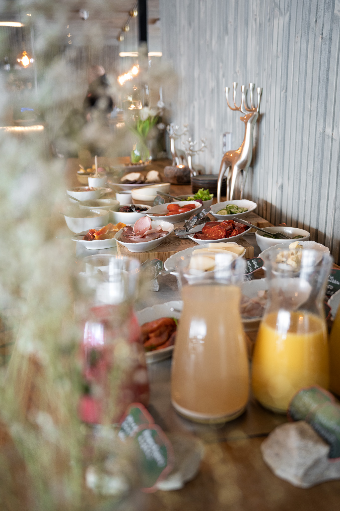 Aamiaiseen sisältyy seisova pöytä, joka koostuu laadukkaista ja lähellä tuotetuista raaka-aineista. Pöydältä löydät muun muassa talon leipää, jonka kanssa voit nauttia erilaisia salameja ja tahnoja, kuten porotahnaa tai lohitahnaa. Myös kylmäsavulohi ja säilötyt kalat kuuluvat aamiaispöytään. Kylmäpöydän keskellä on juustoja sekä kasviksia kuten marinoituja tomaatteja että pikkelöityjä kurkkuja. Keittiömme leipoo pöytään myös vaihtuvia makeita leivoksia.