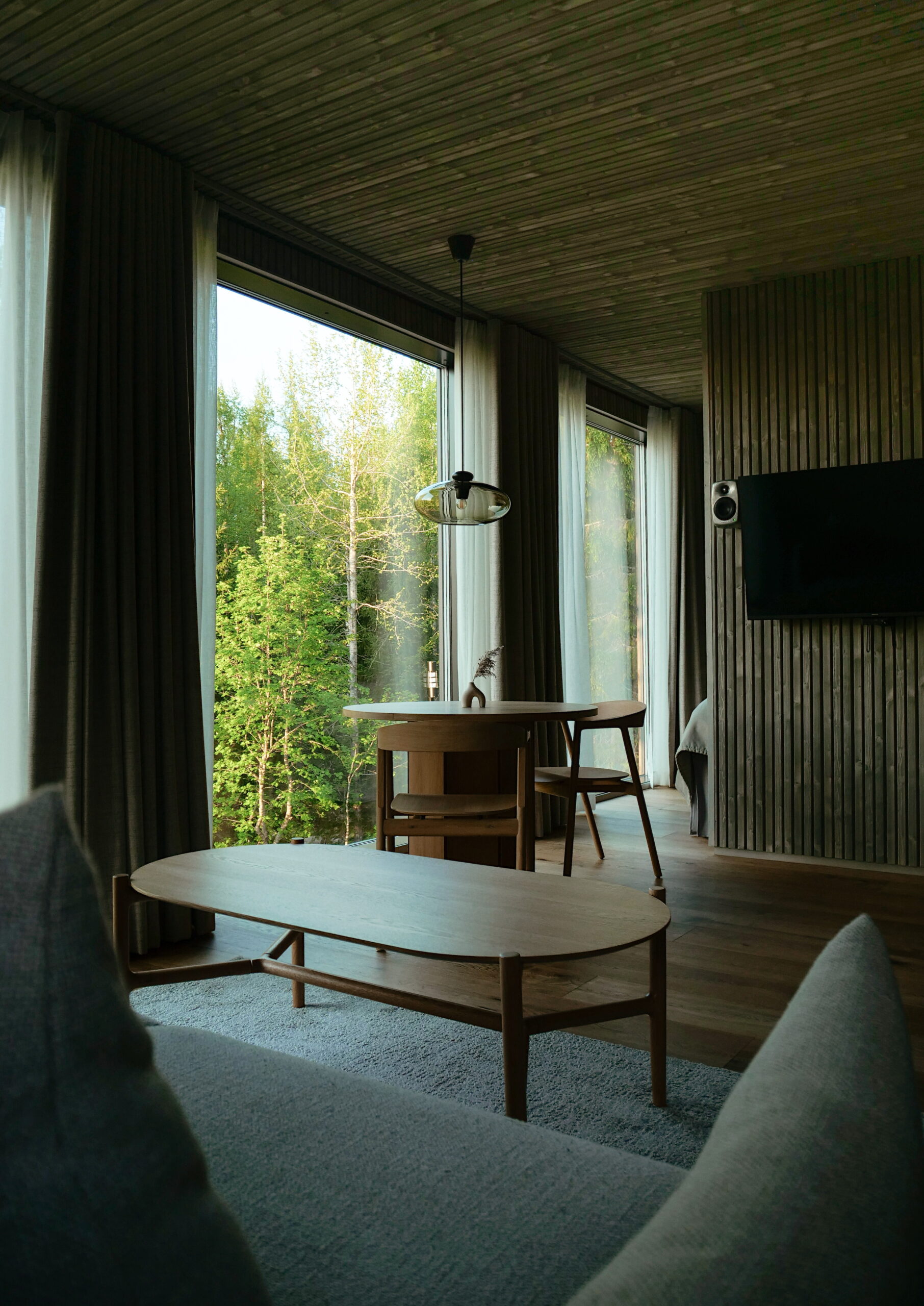 Susi-maisemasviitti on intiimein huoneemme. Se on 24 neliömetrillään lämmin ja läheinen, silti ihanan monipuolinen kahden henkilön vierailulle. Maisemasviittien ikkunat avautuvat pääsääntöisesti kohti horisonttia, mutta myös metsä on lähellä suojaamassa vierailua Suden vieraana.